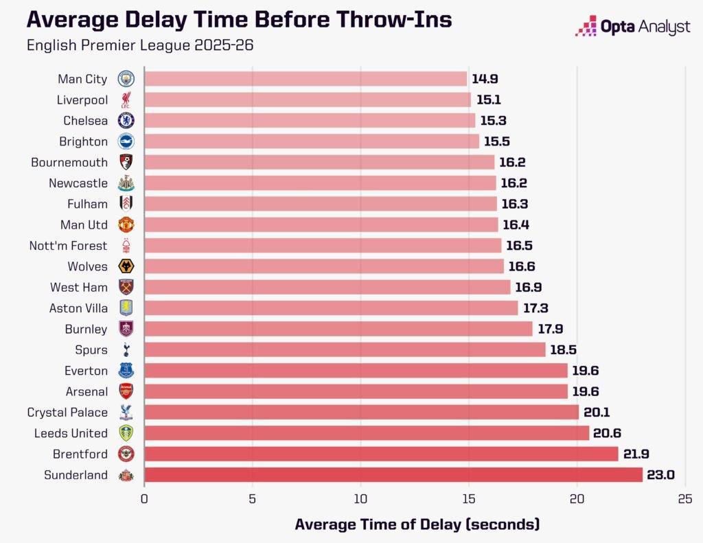 阿森纳59次的拖延次数,显然和1851秒的总拖延时长直接相关。平均下来,他们每次从角球、球门球、界外球和任意球重新开球,需要耗时31.4秒。而在2025-26赛季英超中,共有195次球队重新开球的平均用时超过这一数字。